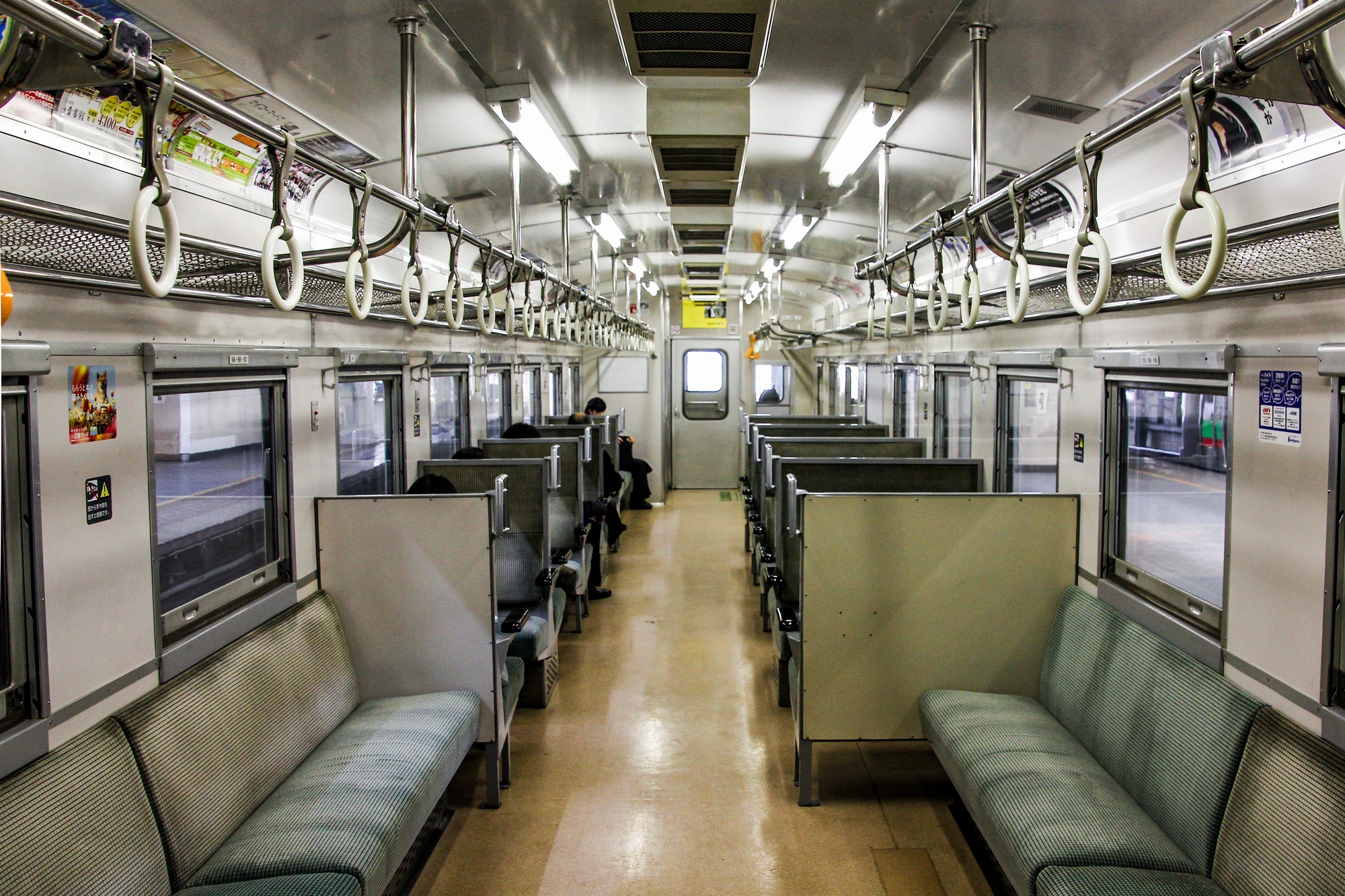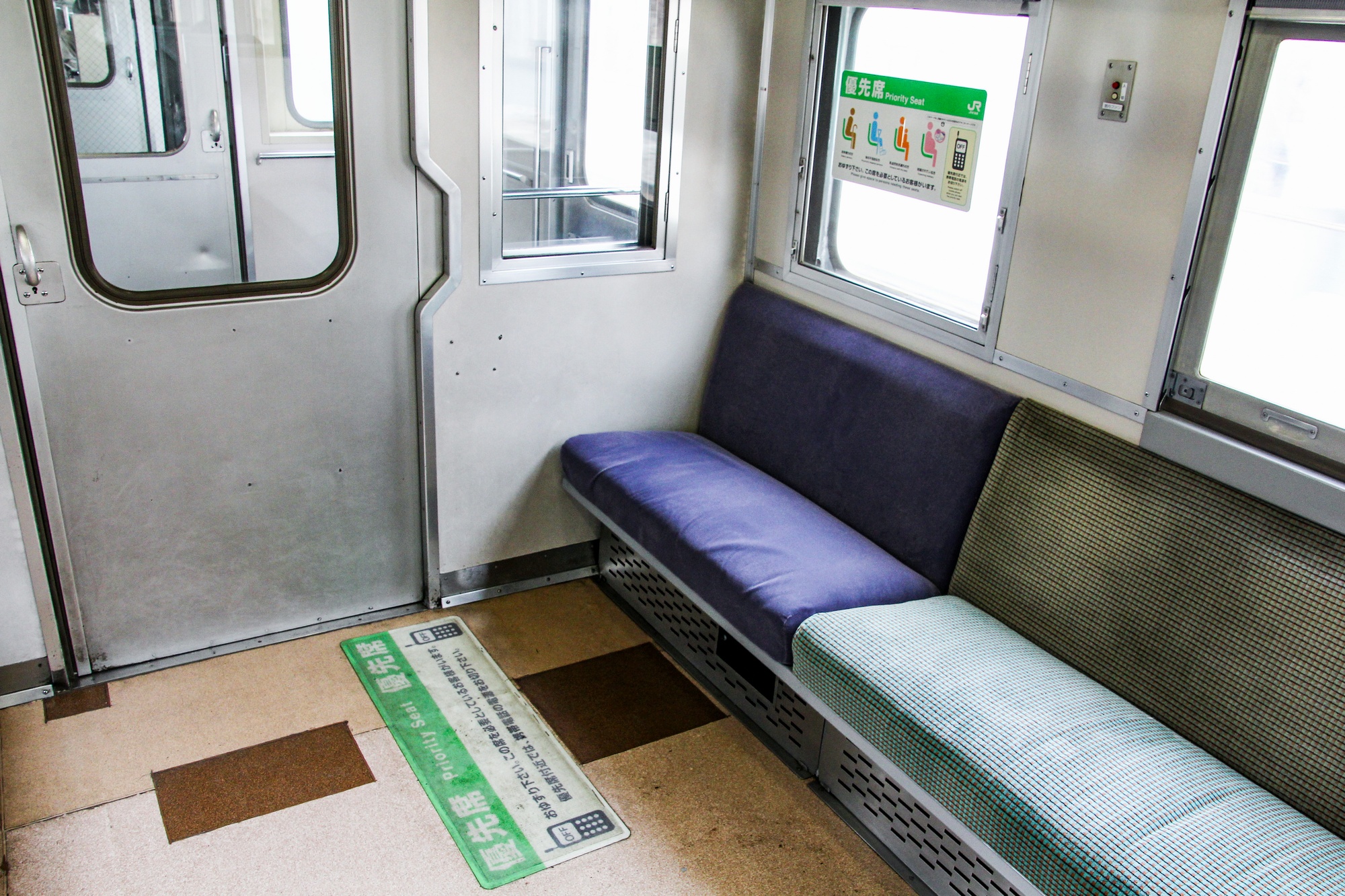 車内は通勤仕様に改造されています。客車時代のデッキ付きセミクロス構成は引継ぎつつ、通勤需要に合わせてロングシート部分を増やし、ボックスシート部分も通路確保のため3列配置(2+1)に改められました。